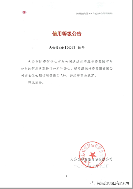 近日,國內(nèi)權(quán)威信用評級機構(gòu)大公國際資信評估有限公司通過對濟源投資集團有限公司主體長期信用狀況進行綜合分析和評估,確定公司主體長期信用等級為“AA+”,評級展望為“穩(wěn)定”,為我市市屬國有企業(yè)目前最高等級。