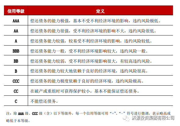 主體信用評級是以企業(yè)或經(jīng)濟主體為對象進行的信用評級,主要分為三等九級,,符號表示分別為 AAA、AA、A、BBB、BB、B、CCC、CC、C,其中除 AAA 級、CCC 級(含)以下等級外,每一個信用等級可‘+’或‘-’符號進行微調(diào),表示略高或略低于本等級。AA+等級僅次于AAA,表明企業(yè)償還債務(wù)的能力很強,受不利經(jīng)濟環(huán)境的影響較小,違約風(fēng)險很低。