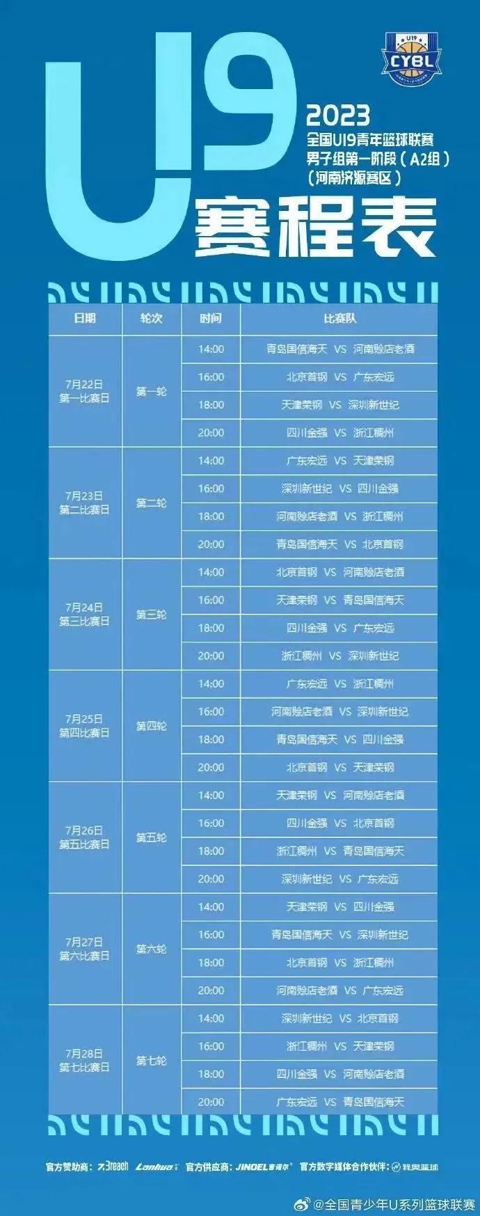 7月22日至28日,2023全國U19青年籃球聯(lián)賽在集團公司所屬籃球城公司體育館如期舉行,為廣大球迷朋友們奉上精彩的賽事,展現(xiàn)競技體育魅力!2023全國U19青年籃球聯(lián)賽男子組第一階段(中原銀行濟源分行)賽區(qū),有來自北京、天津、河南、山東、浙江、廣東、深圳、四川的8支球隊參賽。??